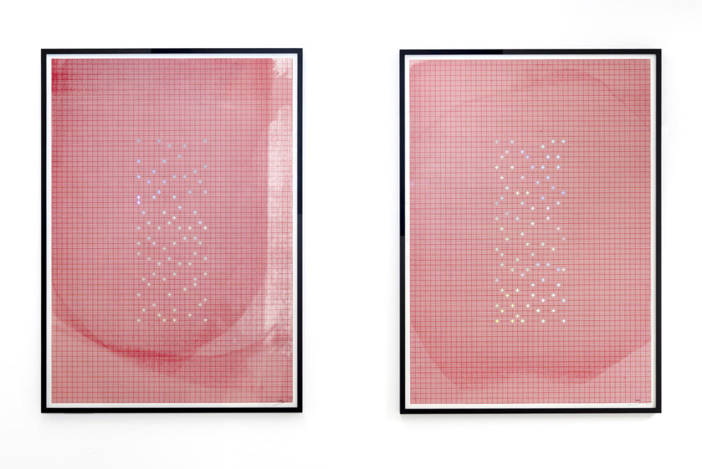 Till Langschied – Systems of Enhancement – 2026 – holographic stickers on silk screen on paper – exhibition view See You Next Tuesday Basel